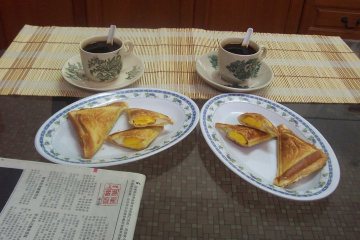 9、夹出4片三角形香热金黄鸡蛋面包做早餐。