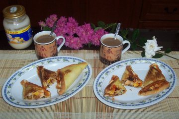 5、上面放些鸡蛋丝和黄瓜丝后,将另一半面包折回。(另外三片同样方法做好)