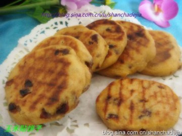 (1)将玉米面、黄豆粉与小苏打混合均匀,然后加少量温水,和成面团。用尖底铁锅放在火上烧水,水开后,两手沾水将和好的玉米面放在掌上,做成饼子形,贴在铁锅水面以上的锅壁上,旺火烧约10分钟后,改文火烘烤,约30分钟即可。