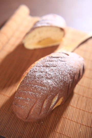6.将作法4面糰整形成长条状,包裹地瓜丁后,整形成橄榄状,移入发酵箱,以温度38℃、湿度85%进行最后发酵约45分钟,入炉烤焙,以上火200℃,下火180℃,烘焙约20分钟即可。