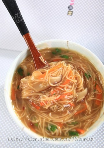 2.取一汤锅,倒入高汤、麻笋丝、生香菇丝、红萝卜丝及柴鱼片煮至滚沸,再放入做法1中泡好的红面线。