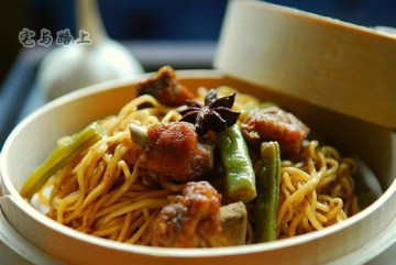 排骨,细面条,四季豆,葱头,姜,八角,桂皮,花椒,干辣椒,冰糖,生抽,老抽,黄酒
