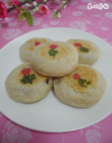 27. 在饼坯的表面粘上一小片香菜叶做点缀,饼坯就做好了