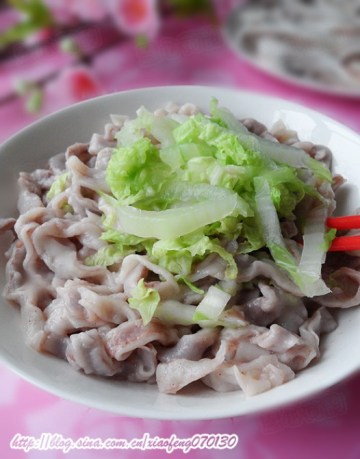 28.将生面条放到开水锅中煮熟,白菜切成丝也一起放到开水锅里煮熟,捞出后放在容器里。仔细看看,两层白色的小麦粉中间夹一层淡红色的高粱面夹心,加上绿油油的白菜丝,一碗面条里红、白、绿相间,风情万种,浇上自己喜欢的“调和”,顿时会让你胃口大开,饥饿难耐,吃了后你保准还会说:这面吃的舒坦可口