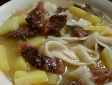 2、淡盐水活团面,熏马肉的汤里切些土豆块块进去;面成条,扯成薄薄的长面片丢进去,略撒点熏马肉、熏马肠、蒜泥进去,~开吃咯~~