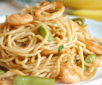 湿面,四季豆(洗净切段),基尾虾(去壳、虾线洗净),鲜鱿(洗净切细圈),葱(切段),姜(切片),蒜(切片),适量鲍汁,酱油,盐,鸡精