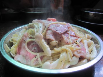 陕西小吃简易蒸面皮、蕃茄肉酱意大利面、海鲜意大利面。