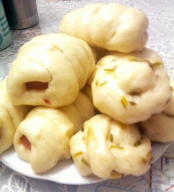 2、发好的面团粘点面粉再揉匀,揪下一小团拉成长条,绕在一段红肠上就做成了热狗。再揪下一小团拉长,粘上葱再卷成球状就是花卷。