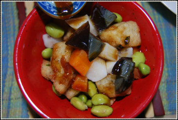 10、所有的都可以端上桌了:山药、胡萝卜丁、毛豆、皮蛋丁、葱花小馒头,将这些内容装进自己喜欢的小碗,撒上自己调制的醋色拉酱汁,香醋葱花小馒头就告捷了。那味道真的一点不会输给甜味的“七彩黄金小馒头”。