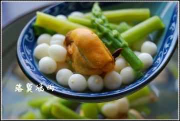 5、将海虹汤烧开,下芡实和芦笋还有还红肉一起煮5-8分钟,撒适量食盐。