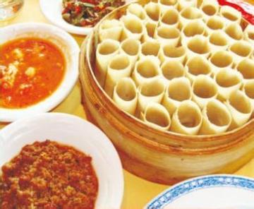 ③制栳栳:将莜面倒入盆内加适量白面搅匀,倒入开水烫面,边倒水边搅拌,趁热揉成若干个小面剂,逐个在铁皮案上推成猫舌状,长10厘米,宽5厘米的薄片,用右手揭起搭在二拇指上,卷成中间空的小卷,竖在蒸笼里,依次摆放,上急火蒸10分钟即可。