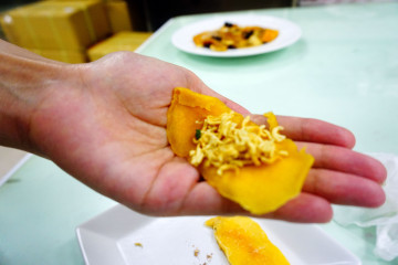 科学面是用一小包的那种,所以调味粉都已经加进去了,不需要额外的调味 只是在倒科学面的时候要小心,避免太多洒出来 配上金箔芒果果干,超方便又好吃!