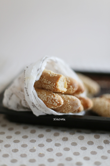 2. 做好的芝麻棒稍凉之后吃非常脆,但隔夜后会变得非常有嚼劲,真真的锻炼牙口,所以可以在品尝前给芝麻棒表面喷少量水,入烤箱烤脆后再品尝。