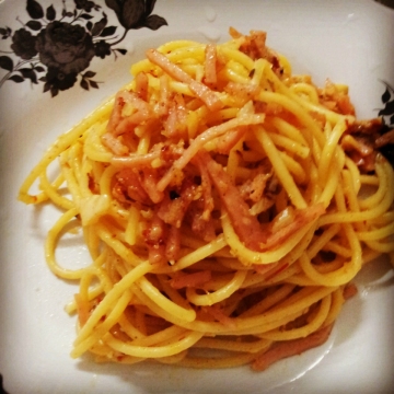 意大利面1把,培根或肉末,洋葱,大蒜,西红柿,番茄酱,法香,盐,白糖,黑胡椒,奶酪粉