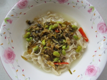 原料中毛豆可换成黄豆芽,则成为雪菜黄豆。