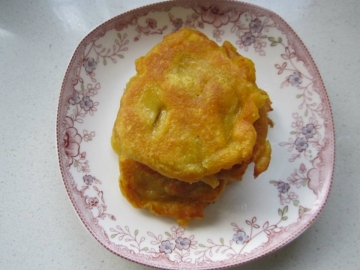 5.油烧热后,把饼坯放进锅里用小火慢慢煎至略为鼓起,比原来稍大,要注意翻动, 以免糊掉,把两面煎成金黄色,就可上碟了。