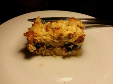 面包(用量见图),盐适量,12个鸡蛋,牛奶或奶油或牛奶奶油混合物600ml,黑胡椒粉适量,肉豆蔻3g,培根适量,菠菜适量,cheddar cheese适量(用量大概铺3层)