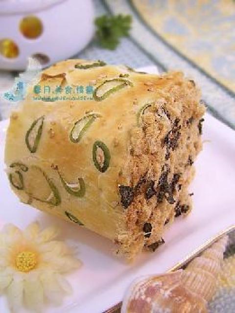 1.将上述材料做发酵面团发酵 擀成大片放入烤盘里醒发 当再次醒发2倍大时 在面上刷鸡蛋 撒上肉松 香葱