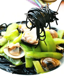 3.于作法2的锅中放入作法1的义大利面煮1分钟,加入捞起的蛤蜊、九层塔丝及其余调味料拌匀即可