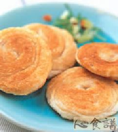 2.以中火将葱油饼皮煎约3分钟至饼皮呈现金黄色的酥脆外观,即可起锅。