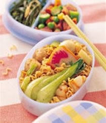 (3)油锅加热,先放入洋葱爆香依序放入木耳、小黄瓜丁、蕃茄丁、蛋皮略炒一下,再加入拉面及咖哩粉等调味料拌均匀即可盛入便当中。