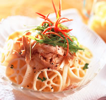 3.洋百合底切片,与作法1的鸡肉、作法2的面加美乃滋、橄榄油一起拌匀,放上少许红甜椒装饰即可。