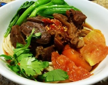 2.面条以滚水汆烫至熟,捞起放入大碗内,加入作法1的药炖高汤及牛腩即可。