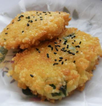 6、热油锅,开小火煎到两面金黄色,撒上芝麻粒即可啦。