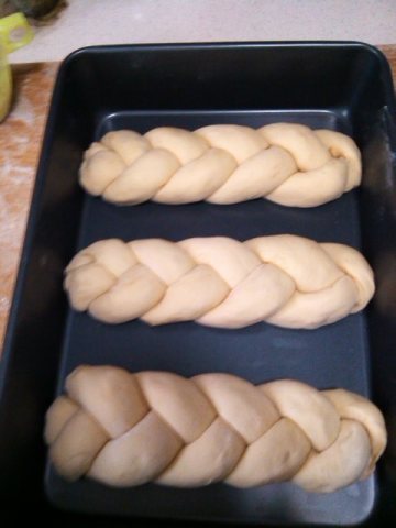 2.取三条面团,把一头粘合,编辫子,不用编得过紧;收口一定要捏紧,不然第二次发酵以后会散开;依次编好三条辫子,放进烤盘;把烤盘放进烤箱,下面放一碗水,开发酵档发酵至2倍大(大约30~40分钟)