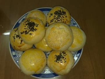 将面粉300克倒入六成热的油锅中,炒拌均匀,待呈浅黄色时盛出,晾凉即为油酥。核桃仁、青梅均切成小丁。面粉100克加白糖、桂花、麻油、青梅丁、核桃仁一起拌成馅。面粉30克加凉水50克放另一盆内,调成稀面糊。余下的面粉放盆中,加苏打,用温水300克和成面团,案板上刷层油,将面团放上反复揉揣,擀成大片,放上油酥,摊平,卷起长卷,再切成20个剂子,逐个擀成圆皮,包入馅,收严口,按扁,在正面刷上稀面糊,粘上芝麻,做成饼坯。平底锅上火,抹油烧到六成热,放入饼坯,见底部呈黄色,翻个烙另一面,至八成熟,再放入烤炉内,约烤8分钟即成。
