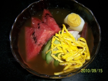 6.大碗中一次荞麦面上面加+黄瓜和红萝卜片+酱牛肉+半个鸡蛋+鸡蛋丝+西瓜+冷面汤。