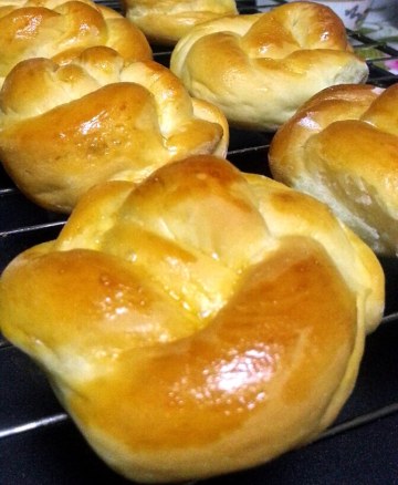 1.干酵母溶于温牛奶,除黄油外其它原料揉成面团,再分次将黄油加入,揉至面团光滑有弹性!揉好的面团加盖保鲜膜,放温暖湿润处进行第一次发酵,发酵至原来的2.5-3倍大左右即完成第一次发酵。