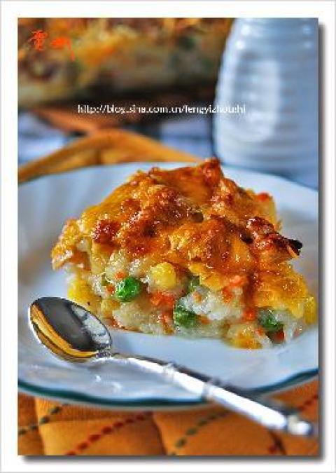 5.将作法3的材料上淋上面煳,撒上起司丝,放入约180℃的烤箱烤至表面金黄上色即可,食用时可撒上起司粉风味更佳。