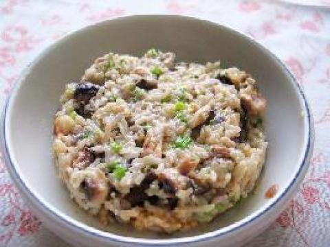 干香菇适量,洋葱一个,蒜头适量,芝士60克,米半杯,高汤一杯,白酒或肉汤四汤匙