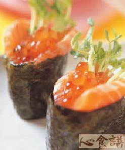 鲑鱼生鱼片2片,萝卜婴适量,鲑鱼卵20公克,寿司饭适量,海苔片2小片