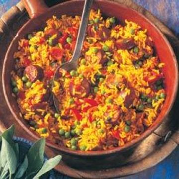 清鸡汤300毫升,橄榄油2汤匙,中等大小红洋葱1颗,大蒜1瓣,中等大小红甜椒1个,长米200克,姜黄粉1茶匙,罐装番茄块400克,盐、黑胡椒适量,西班牙辣味熟香肠175克,新鲜鼠尾草1小束,冷冻豌豆175克