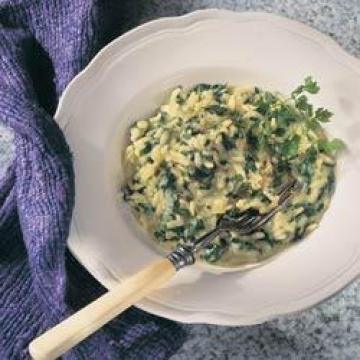 蔬菜清汤1.2升(或蔬菜汤粉4汤匙),白葡萄酒5汤匙,嫩菠菜250克,纯橄榄油4汤匙,小洋葱1颗,大蒜2瓣,淀粉质高的大米350克,盐、黑胡椒适量,肉豆蔻整枚