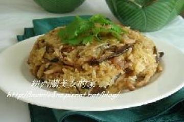 5.热锅,倒入麻油加热,爆香作法2的姜末、虾米,再加入香菇丝、作法3的箭虾、作法1的长糯米及所有调味料一起拌炒均匀至水收干后盛盘。