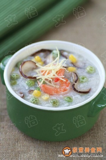 三、锅中倒入清水大火烧开后,倒入隔夜饭用勺子搅散,锅中放入一把勺子,半盖锅盖,用中小火煮25分钟后,倒入香菇丝煮5分钟,再倒入玉米粒和豌豆继续煮5分钟。最后倒入鲜虾和姜丝,2分钟后关火放盐,鸡精和香油调味