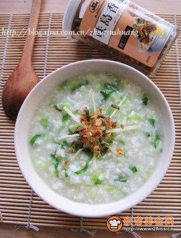 三、将小油菜洗净切成细末放入粥中烫熟即可,出锅前撒些姜丝即可