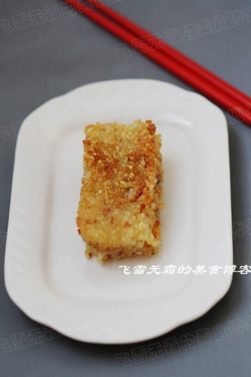 3.把压实的糯米饭倒扣在放有面粉的案板上,刀沾上凉白开水把饭切成小块,然后滚上面粉.在平锅中煎成四面金黄色装盘。