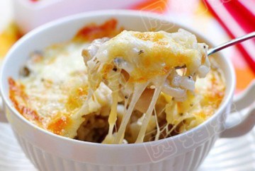 5.将煮好的蘑菇饭放入烤碗内,表面铺上马苏里拉芝士条,烤箱220度预热,放入烤箱中层烤5分钟,至芝干溶化表面有些微黄色即可。(没有烤箱的,放入微波炉用中火叮3分钟,至表面芝士溶化即可
