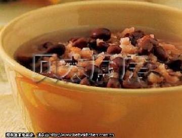 (2)、煲滚水,放红豆、黑糯米及陈皮煲至再滚,改慢火煲2小时,加片糖调味,再放入椰汁煮至沸即可。