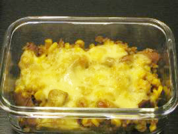 里肌肉1小塊,隔夜米飯1.5碗,玉米粒1小碗,咖喱粉3匙,鹽適量,橄欖油一點點,醬油1匙,料酒1.5匙,十三香粉1小匙,黑胡椒粉適量,黑胡椒碎一點點,蒜2瓣,芝士碎適量
