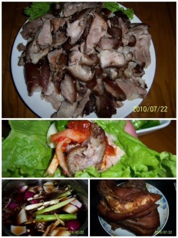 猪排1片,甜豌豆荚5个,红萝卜片6片,卤白菜10公克,酱油2大匙,糖1大匙,八角1粒,花椒少许,水1杯