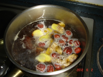 2.将生姜片、切碎的红枣、水500ml、红糖75克放入锅内。