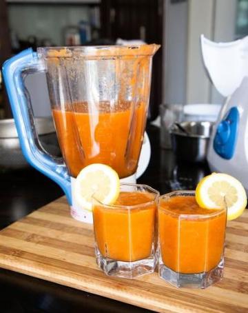 5. 将胡萝卜、苹果、柠檬、西兰花放入榨汁机中搅打成汁;