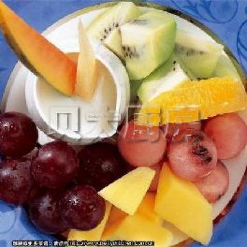 菠萝肉50克,苹果50克,黄桃50克,哈密瓜50克,提子(葡萄也可以)10克,紫色卷心菜10克。调料(1)凉开水500克,柠檬汁5克,盐5克,白糖200克(制成浸泡汁)。(2)酸奶75克,炼乳5克,果酱5克。