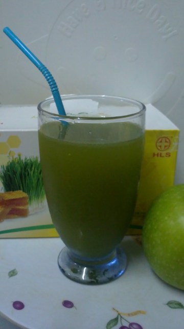 ①先将水和白糖一起煮滚,熄火后,加入青色素及小麦草汁,拌匀,待凉;