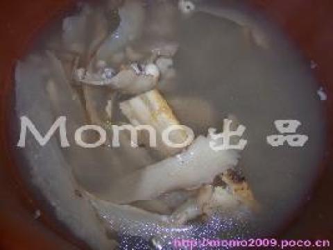 3,将5斤水倒入煲内,将水烧开,再将所有用料倒入。先大火烧开,再小火煲1.5小时即可,加冰糖。